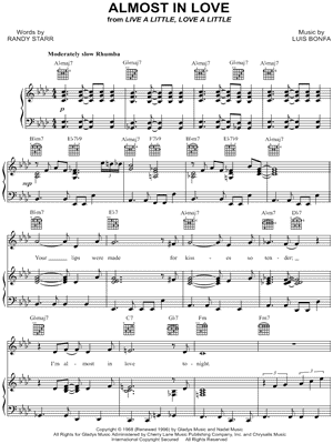 A história envolvendo a participação de Luiz Bonfá na gravação de Almost in Love (na imagem ao lado, partitura da música) ainda é muito controversa e, infelizmente, o compositor faleceu em 2001, sem esclarecer bem as circunstâncias que levaram Elvis Presley a escolher uma de suas músicas para o já citado filme. Vamos agora à questão sobre como a música foi escolhida para fazer parte do repertório de Elvis e do citado filme (na imagem abaixo, Elvis e a atriz Michele Carey ao som de Almost in Love). O jornal Folha de S. Paulo, entrou em contato com o próprio Luiz Bonfá, para uma matéria publicada no dia 16 de agosto de 1997 (lembrando os 20 anos da morte de Elvis) onde se tentou esclarecer o fato. |