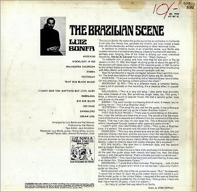 | Mas, outras questões podem ser respondidas com maior precisão. Segundo o jornalista Luiz Nassif (comentarista de economia), a canção de Bonfá já existia, com o nome de "Luar no Rio" e foi composta para o álbum "A Cena Brasileira" de 1966, que nos Estados Unidos foi lançado com o título de The Brazilian Scene (nas fotos acima, a capa e o verso do disco). E Luiz Nassif está absolutamente correto! A versão original intitulada Moonlight in Rio, pode ser ouvida no Youtube, e não deixa dúvida de tratar-se da composição musicada de Almost in Love, de onde se conclui que a mesma não foi composta especialmente para Elvis! Outro dado, Luiz Bonfá não consta da gravação dessa canção, pelo que nos informa Ernst Jorgensen em seu livro "Elvis Presley: A Vida na Música", que traz a ficha completa (inclusive dos músicos) de todas as sessões de gravação do cantor. O que não significa que Bonfá não possa ter participado, até porque, a musicalidade da gravação está bem enquadrada nas características da Bossa Nova. Talvez o violão tivesse sido gravado à parte e depois mixado na edição final, o que significaria que Elvis e Bonfá jamais tenham se encontrado. Uma hipótese! |