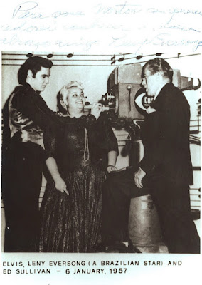| Menos de um ano depois da entrevista para Dulce Damasceno de Brito, Elvis vivia o auge do sucesso e ia para a sua terceira participação em uma das principais atrações da televisão dos Estados Unidos: o Toast of the Town. O programa era comandado por um dos mais conhecidos apresentadores da história da televisão americana, Ed Sullivan e levado ao ar pela rede CBS, a partir de Nova Iorque. E eis que, na noite em que ia se apresentar, 6 de janeiro de 1957, Elvis topa com uma cantora brasileira nos bastidores do programa. Trata-se da paulista (nascida em Santos), Hilda Campos Soares da Silva, cujo nome artístico era Leny Eversong, a qual, na época, iniciava a sua carreira nos Estados Unidos (na foto acima, Elvis, Leny Eversong e o apresentador Ed Sullivan, na noite em que os dois se exibiram). |