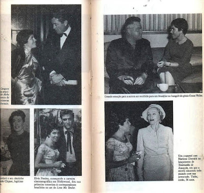 Feito isso, vamos aos fatos. Elvis Presley encontrou-se com uma jornalista brasileira, logo no seu primeiro ano de sucesso, em 1956. O seu nome era Dulce Damasceno de Brito (1926-2008), correspondente dos Diários Associados e da revista "O Cruzeiro" em Hollywood. Dulce também fez entrevistas com astros da época de ouro do cinema norte-americano: Marlon Brando, Marylin Monroe, John Wayne, Burt Lancaster, Rock Hudson, Marlene Dietrich, Clark Gable, Bete Davis, Gregory Peck, Charlton Heston, Orson Welles... Ufa! Seria mais fácil citar quem ela não entrevistou. Ah, e Carmen Miranda? Dulce esteve na casa de Carmem na mesma noite em que a cantora faleceu. E, com um detalhe, a máquina fotográfica foi testemunha de tudo!